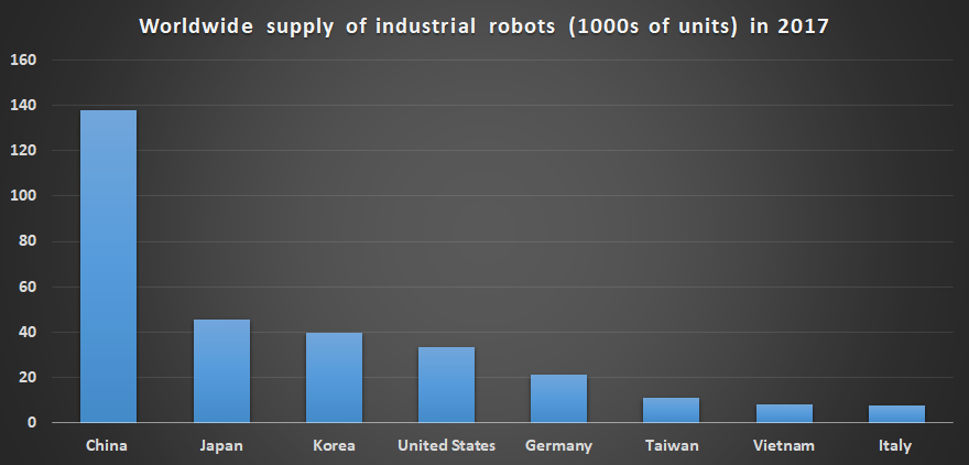 일본의 두 회사 인 Fanuc와 Yaskawa가 로봇 공학의 선두 주자라는 사실은 로봇 세계에서 아시아의 중요성에 대한 증거입니다. 실제로 국제 로봇 공학 연맹 (IFR)에 따르면 5 개 국가 만이 전세계 로봇 장치 수요의 73 %를 차지하고 3 개 국가 (중국, 일본 및 한국은 전세계 수요의 60 %를 차지)가 아시아에 있습니다 . 또한 아래 차트에서 볼 수 있듯이 상위 8 개 중 5 개가 아시아에 있습니다. 상위 8 개 국가 중 중국의 생산 점유율도 주목하십시오.