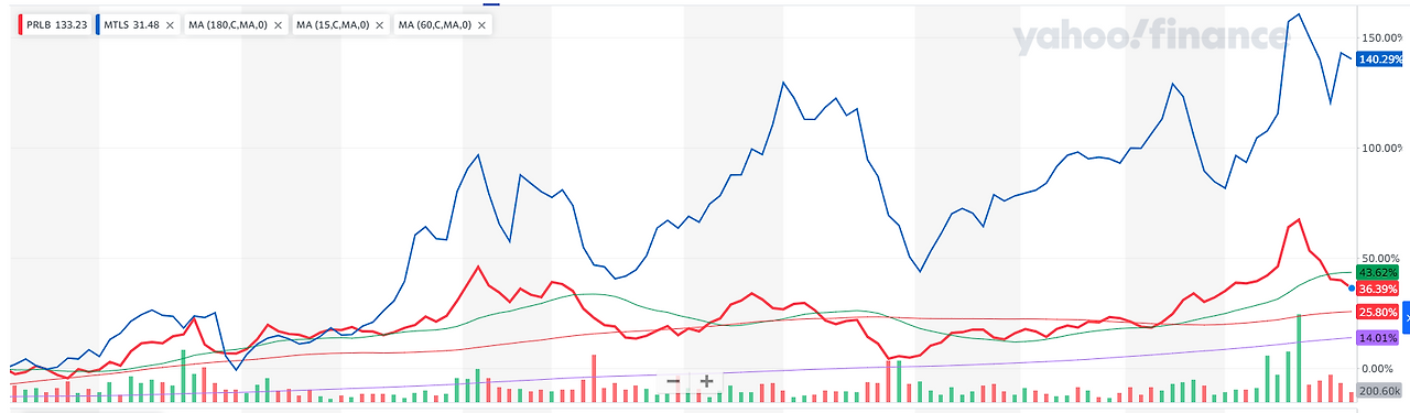 위에서 살펴본 프로토랩스(빨간색)과 머티어리얼라이즈(파란색)의 6개월 주가 그래프 추이다. 같은 3D프린팅 기업임에도 주가 차이가 많이 났다. MTLS는 6개월 간 140%의 수익이, PRLB는 40%의 수익이 났다